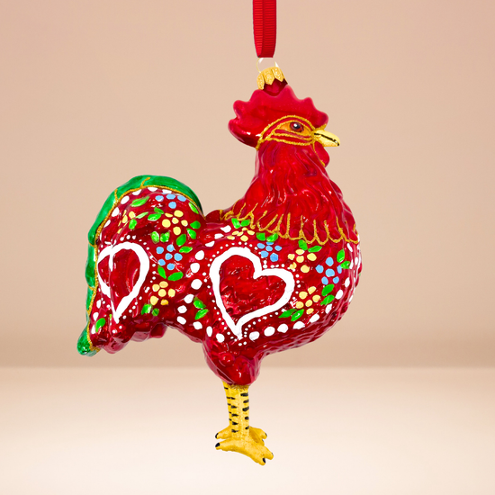 This striking red rooster bursts with life, its bold crimson feathers adorned with intricate floral patterns and heart motifs. Hand-painted details celebrate folk artistry, blending warmth and charm with a touch of nostalgia.