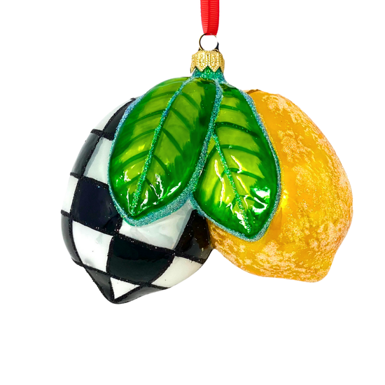 Sun-drenched citrus meets the unexpected in this striking ornament, where a golden lemon contrasts against a bold black-and-white checkered counterpart. Lush green leaves shimmer with delicate touches of glitter, adding a final note of vibrancy to this statement piece. A playful reinvention of classic elegance, it’s a celebration of contrast—where the bright meets the bold, and tradition embraces the avant-garde.