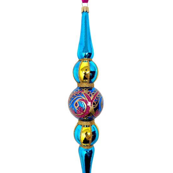This slender showpiece turns tradition on its head with swirling turquoise glass and a gilded band of baroque paisley detail. With jewel-toned symmetry and old-world flair, it’s an ornament fit for a duchess—preferably one with a fondness for mischief and midnight soirées.