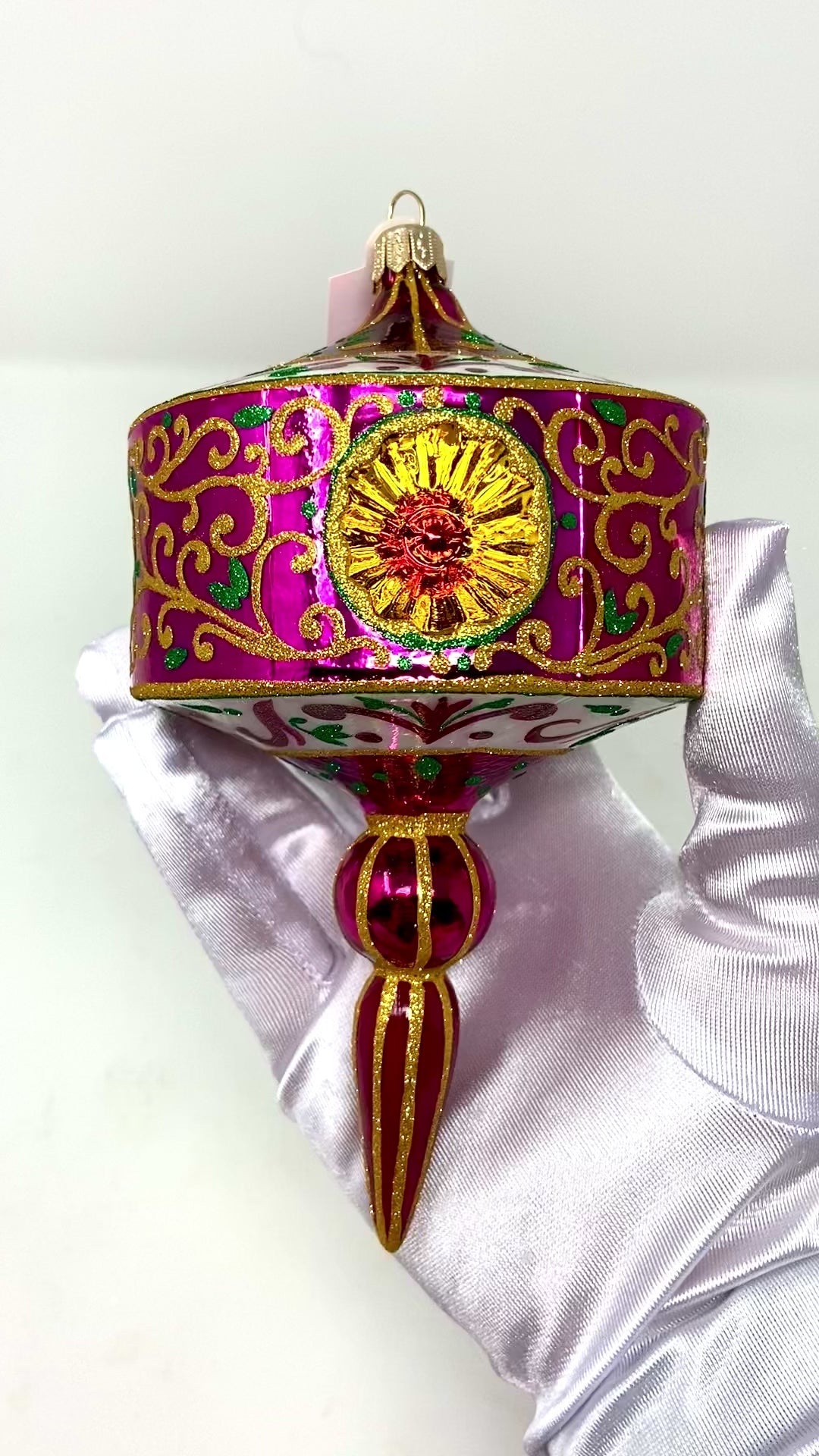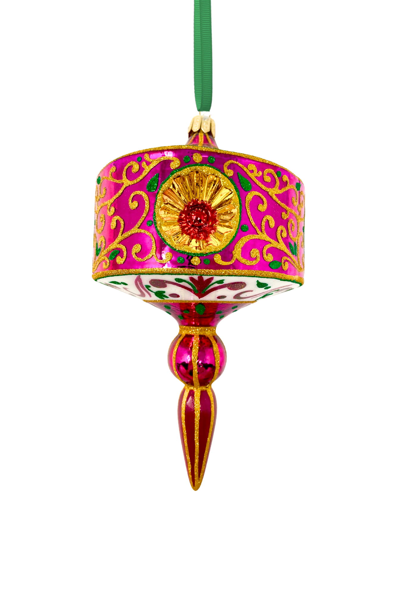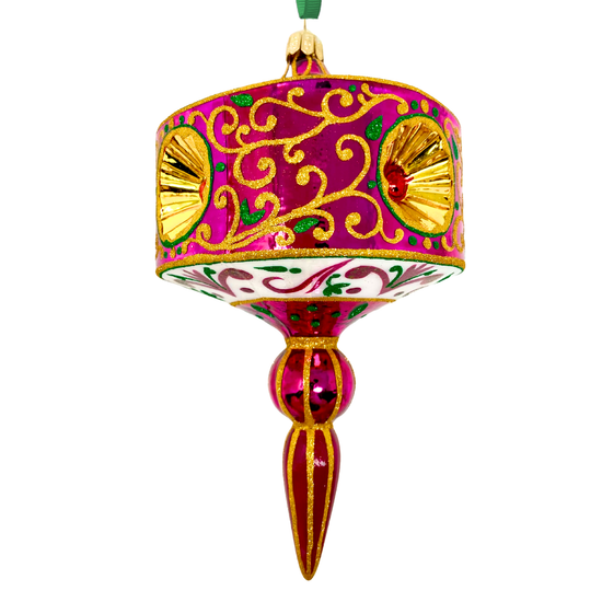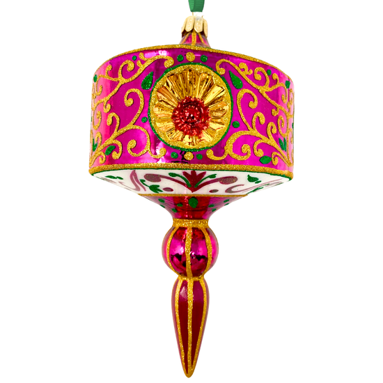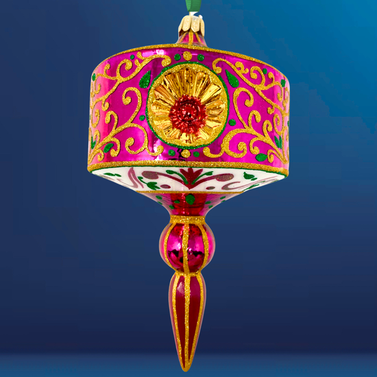 Swirling in fuchsia, emerald, and gold, this dazzling drop channels the unapologetic flair of an Italian festival. She’s the chandelier of your tree, designed to shimmer, spin, and steal the spotlight. When the lights hit just right, she performs her own standing ovation.