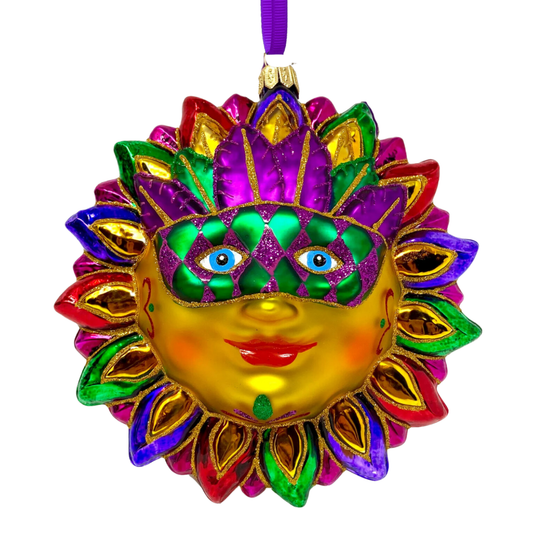 Draped in harlequin diamonds and radiant gold, this Carnival Sun ornament is a luminous expression of revelry. With rich purple, emerald, and gilded accents, it dances between elegance and excess, capturing the uninhibited joy of a festival in full swing. Some celebrations never fade.
