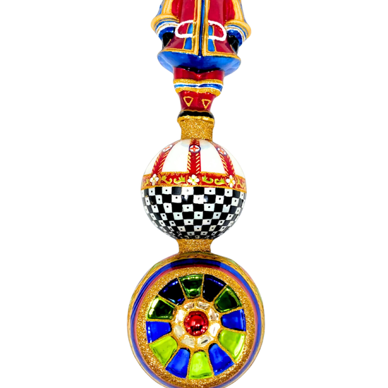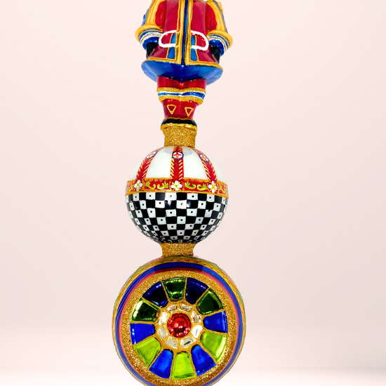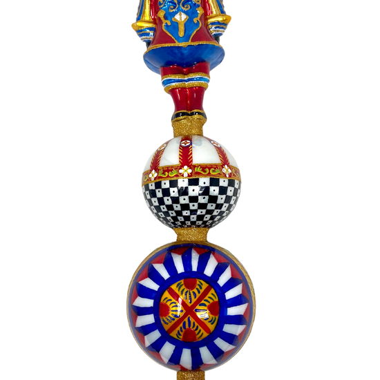 Inspired by Sicilian cart pageantry, this regal guard stands in full parade dress—checkerboard armor, painterly patterns, and a wheel of stained glass glory. He’s not just a tree topper. He’s the head of your holiday household. And yes, he knows it.