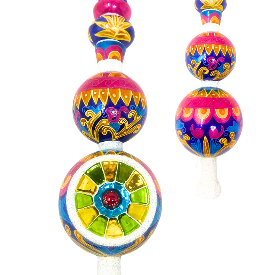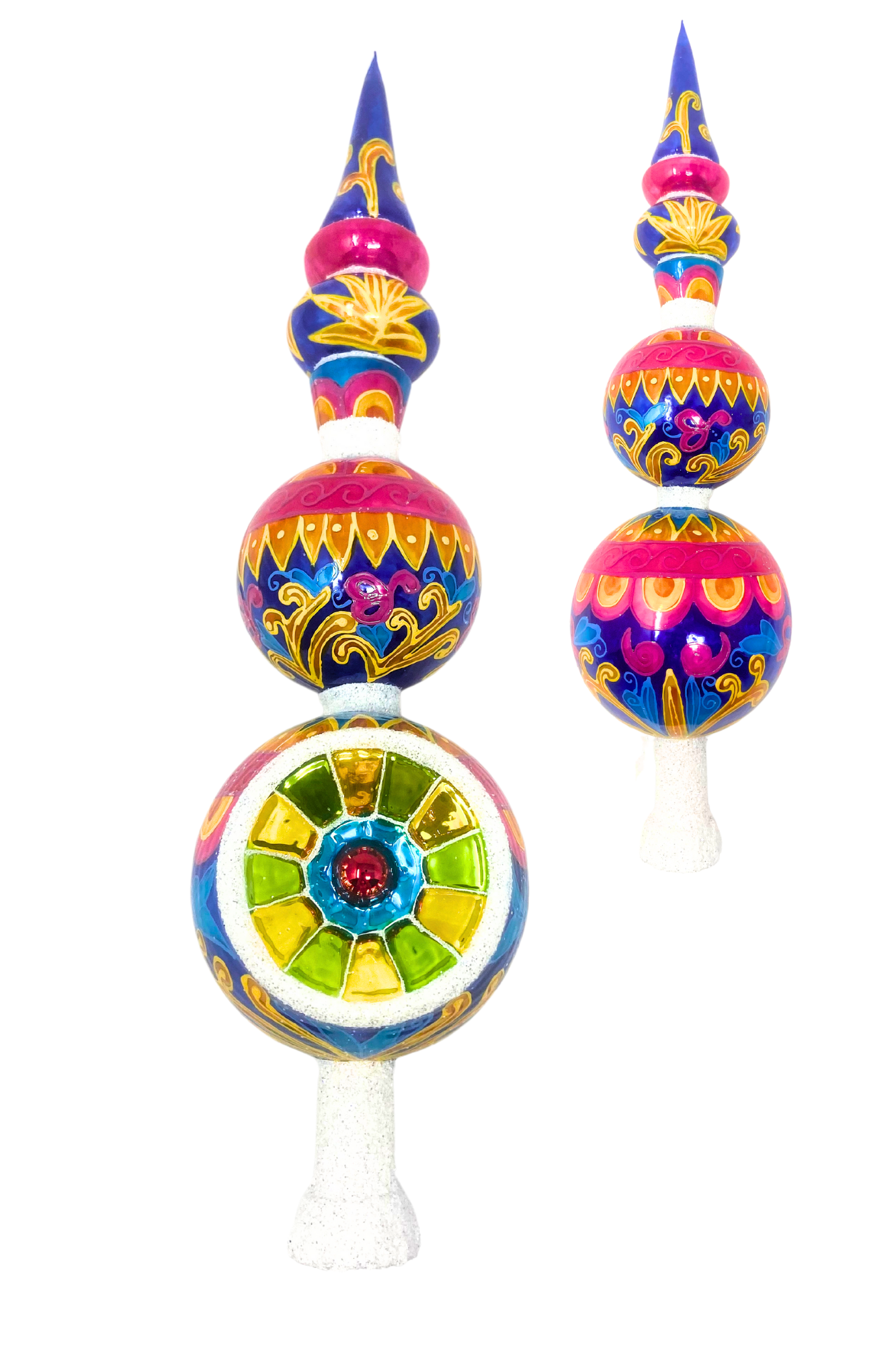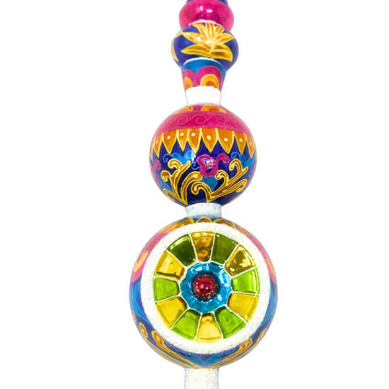 As if lifted from an opera set or the ceiling of a palazzo, this finial bursts with gold flourishes, jewel-toned whirls, and a confetti of high drama. The reflector at its center beams in technicolor, anchoring the spectacle with a dose of Italianate splendor.