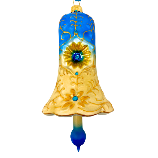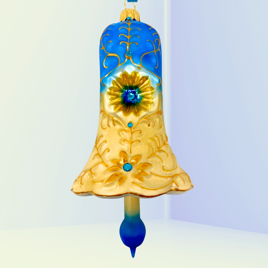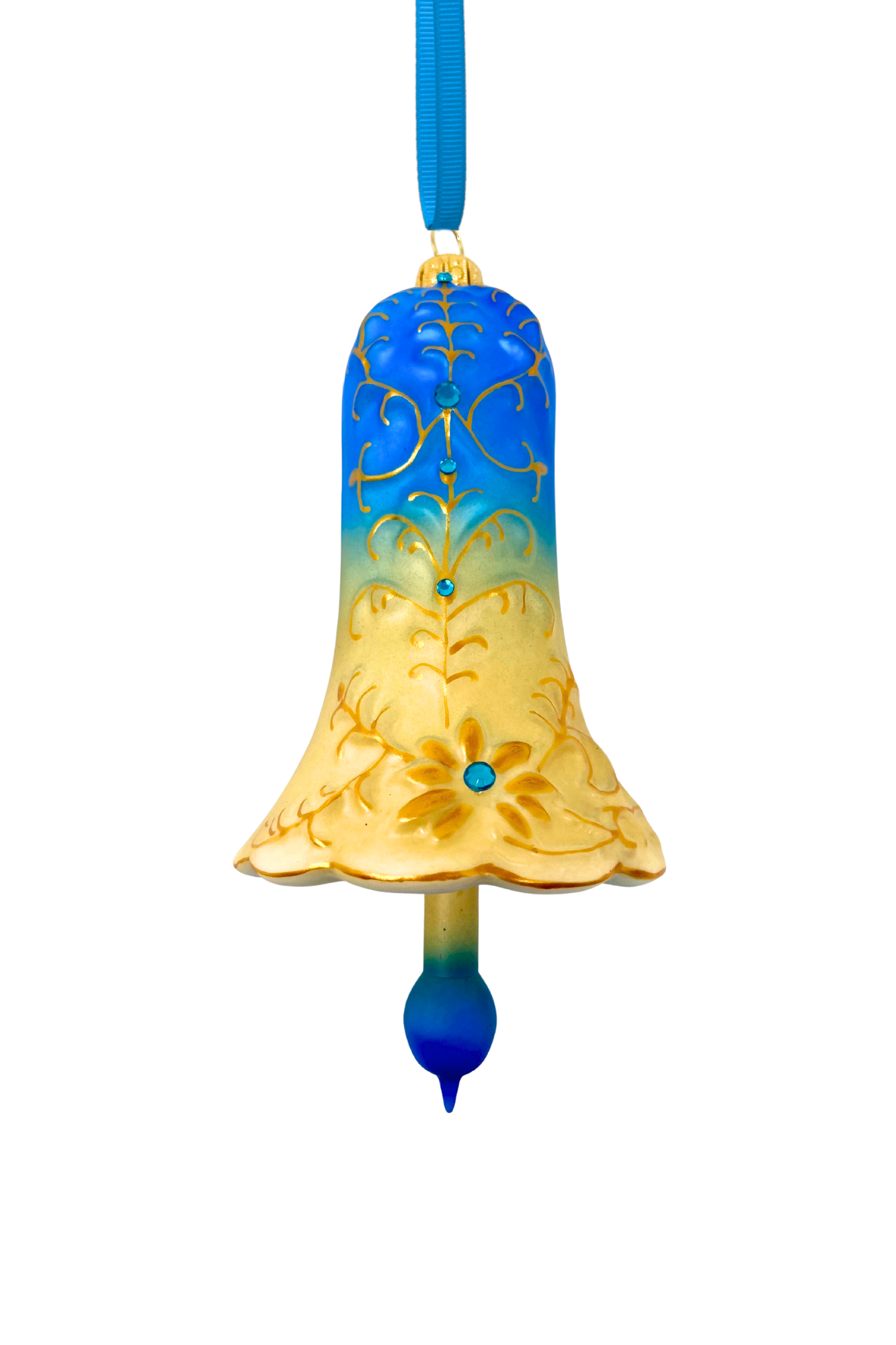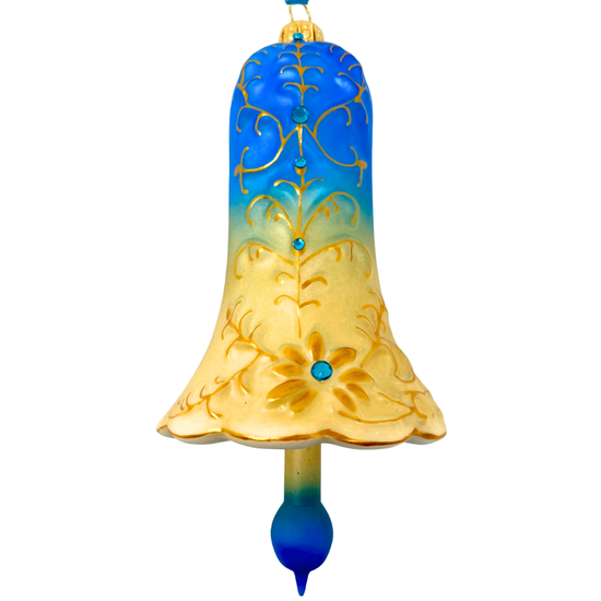 Vivid blue glass rises above a soft ivory bell adorned with intricate gilded detailing and jewel toned accents. The elongated drop draws the eye downward, creating striking vertical movement. This piece brings confident color into the Château story without breaking its refinement.