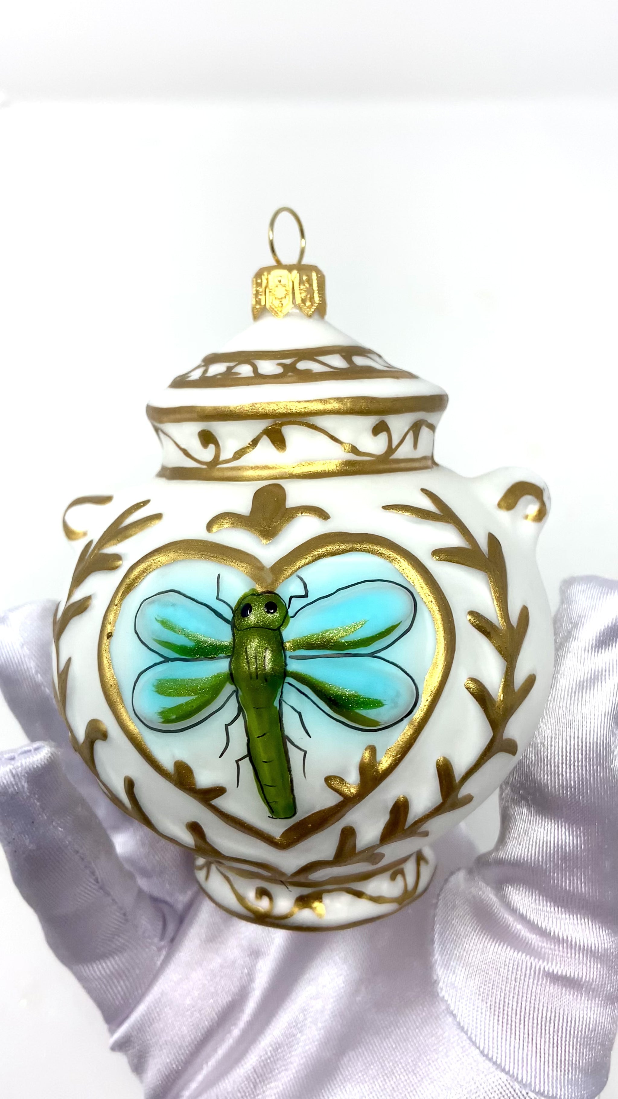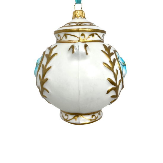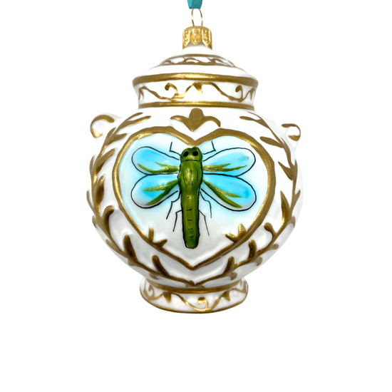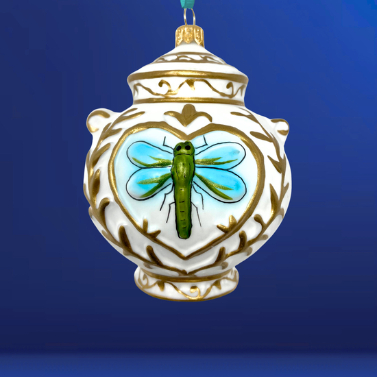 This classic blue and white ornament is anchored by a cool aqua dragonfly that feels calm and collected. Château Bleu channels old world ceramic artistry with a modern glow, offering balance, beauty, and a sense of stillness. She pairs beautifully with silver, gold, and crisp winter greens.