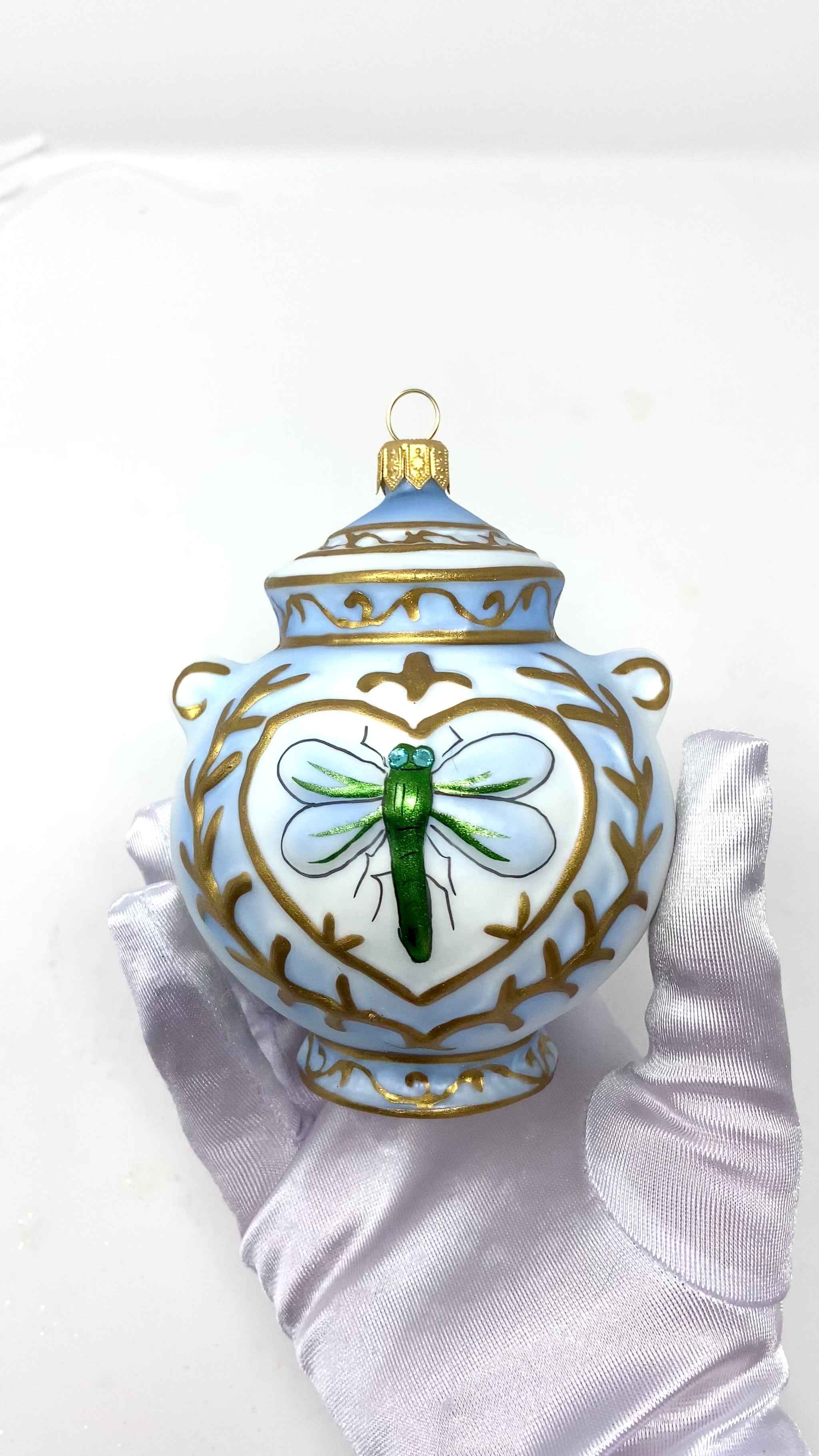 A soft porcelain blue vessel framed in gilded scrollwork, finished with a vibrant green dragonfly at its heart. Château Jardin feels like a quiet morning in a walled garden, where sunlight catches dew and everything feels possible. Elegant yet organic, she brings a breath of nature to the tree.