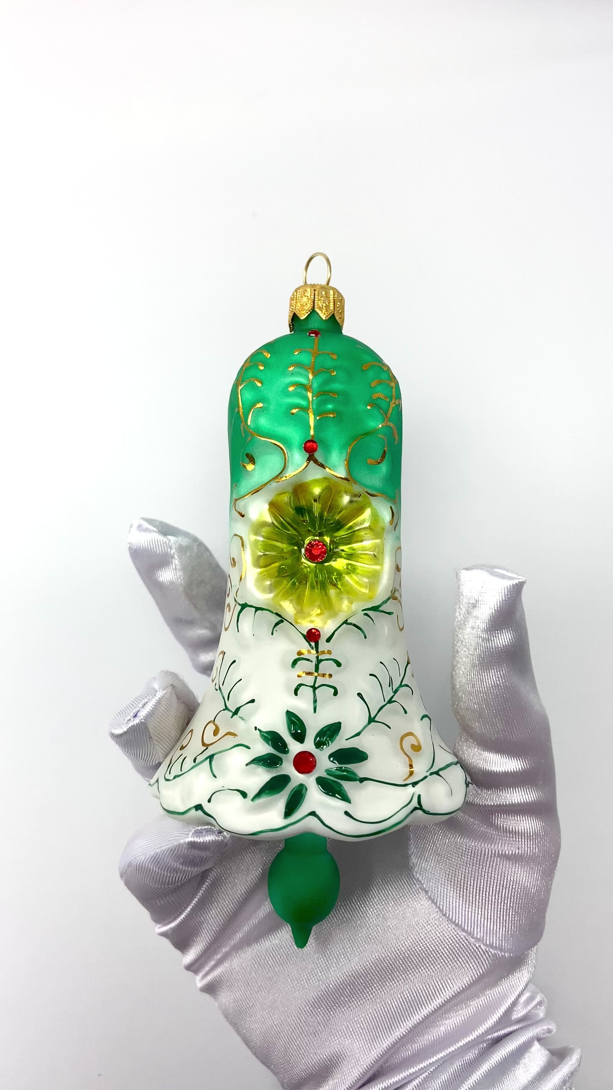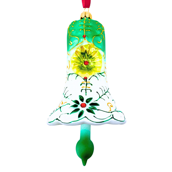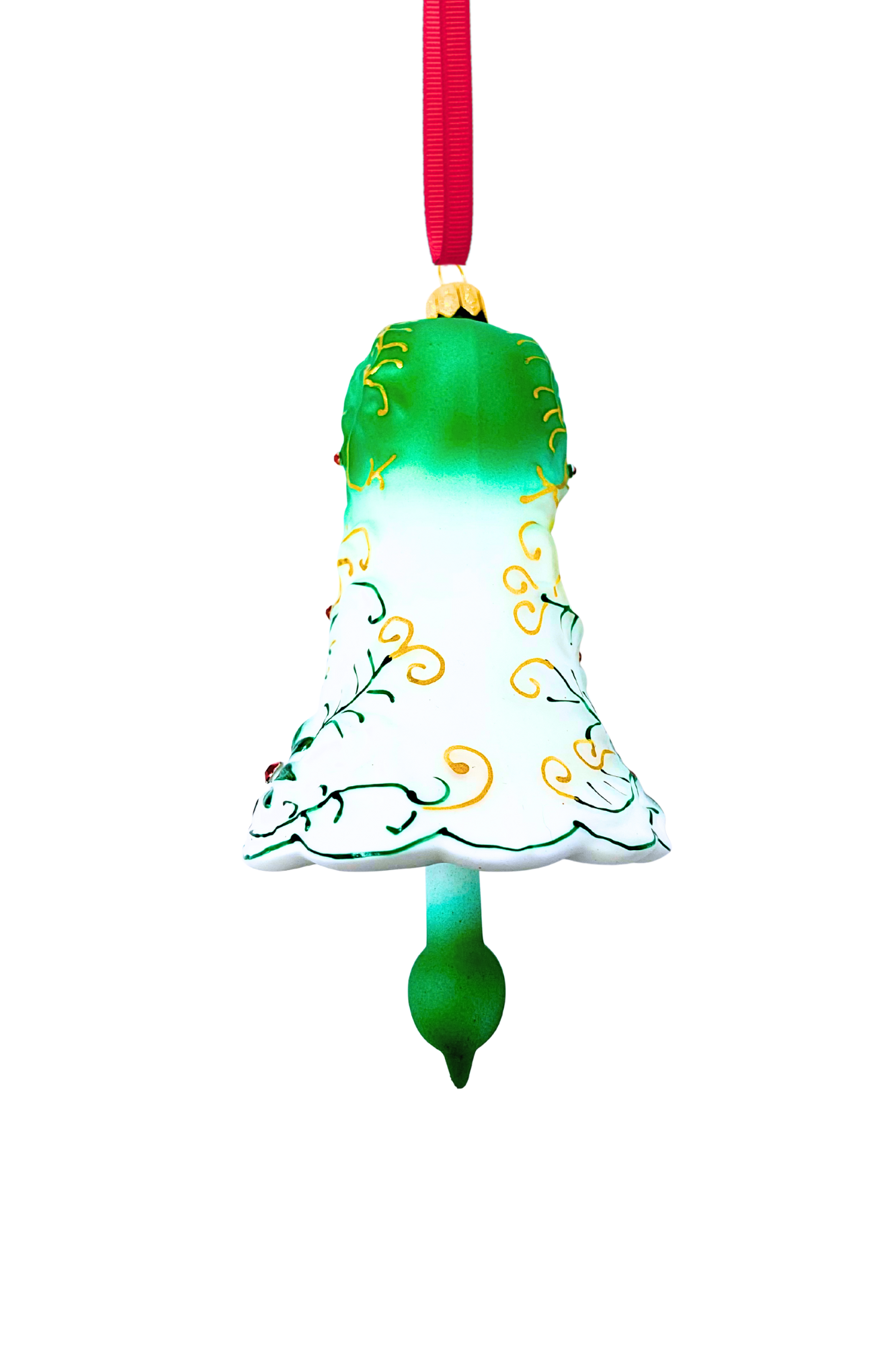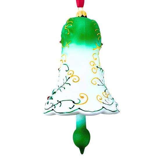 Deep green glass crowns this sculptural bell, wrapped in gilded vinework and punctuated with jewel red accents. The ivory flared skirt softens the silhouette while the elongated drop adds architectural drama. It feels like a garden room at dusk, formal yet alive with detail.