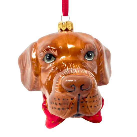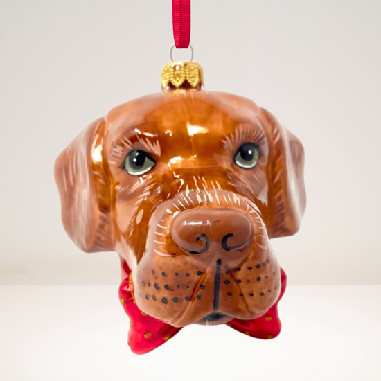 With soulful eyes and a warm, chocolatey coat, this handcrafted ornament captures the unwavering devotion of the beloved Labrador. A dapper red bow tie adds a touch of festive charm, making this a perfect keepsake for dog lovers and holiday revelers alike.