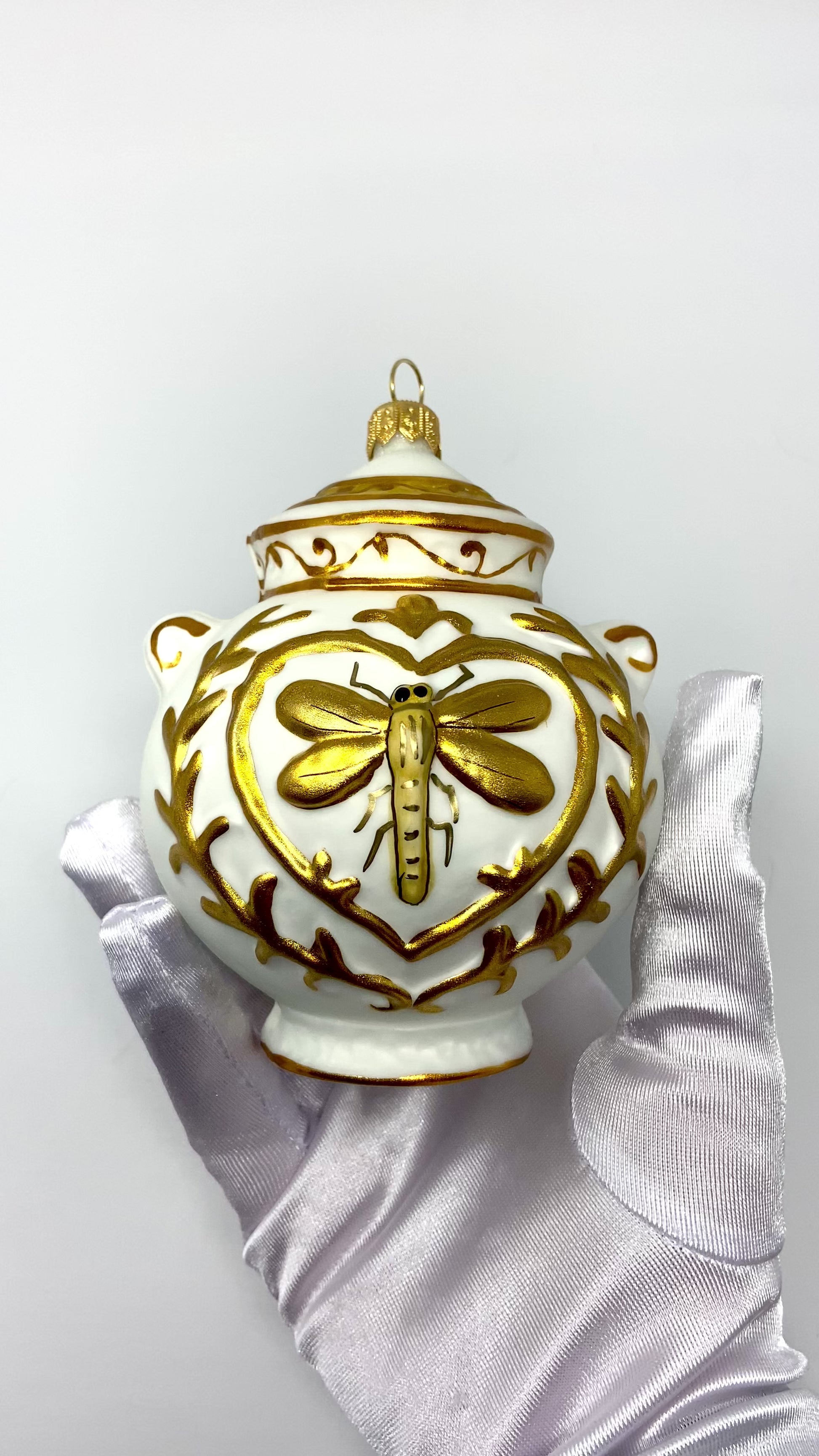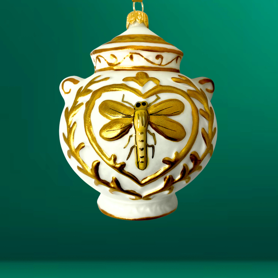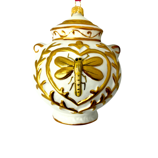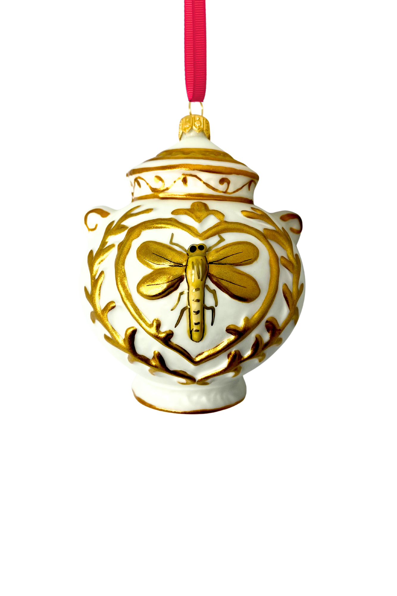 A golden dragonfly rests at the heart of this porcelain inspired jar, framed by scrolling gold details. Light in spirit yet intentional in design, the dragonfly introduces movement and meaning to a stately form. It is grace rendered in gold.
