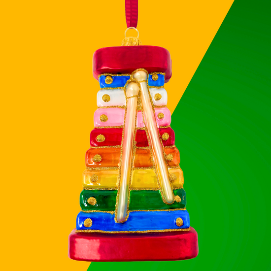 An orchestra of color and childhood memories. This exquisite glass ornament is a symphony of bold primary hues, accented with delicate golden notes. The mallets rest with effortless poise, hinting at melodies yet to be played. A refined take on a playful classic, suspended in time.