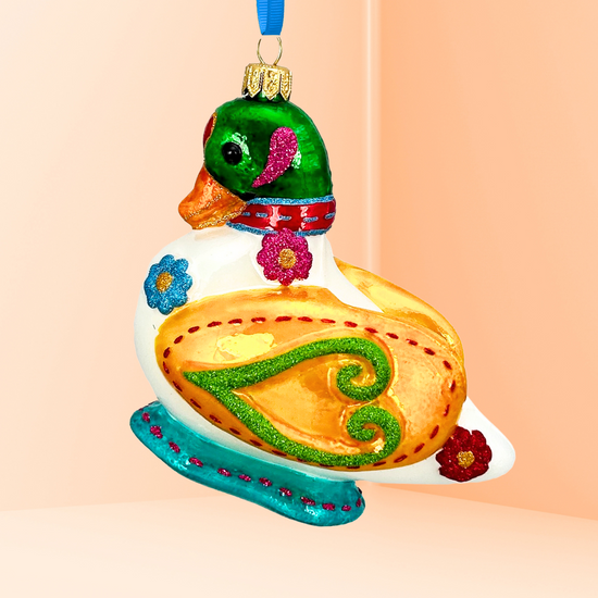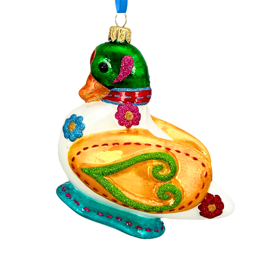 This white folk duck glows with an ethereal beauty, its soft ivory tones accented with intricate emerald and ruby flourishes. Hand-painted details shimmer under the light, evoking a sense of old-world artistry fused with a modern, whimsical twist. A piece that bridges the past and present in effortless grace.