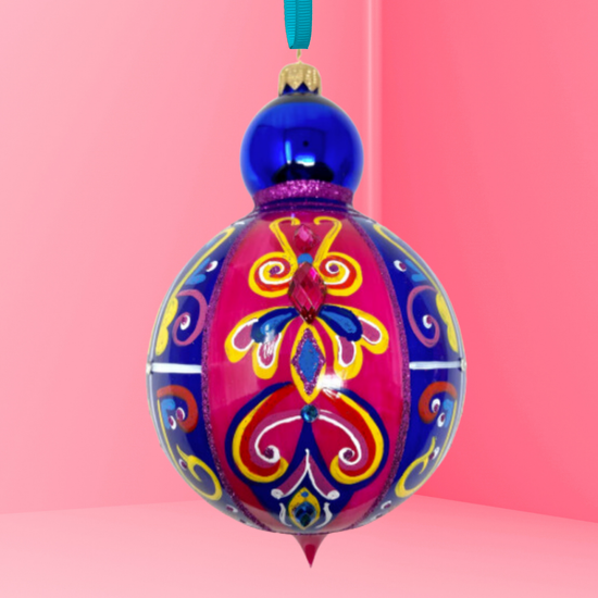 An ornament that doesn’t just decorate—it commands attention. Bloom is a study in vibrant contrast, where deep sapphire and bold fuchsia intertwine in a striking display of hand-painted scrollwork. Gilded flourishes dance across its surface, punctuated by glimmering gemstones that catch the light with every movement.