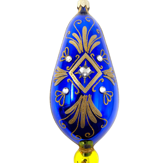 This elongated beauty shimmers in royal cobalt with golden flourishes that dance like candlelight on cathedral stone. A single diamond-like gem is set within an ornate crest—timeless, tasteful, and slightly theatrical.