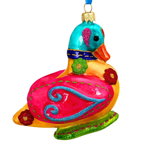 Swirls of fuchsia, sapphire, and golden yellow dance across this glass folk-art duck, each detail a tribute to artisanal craftsmanship. Vibrant floral accents and delicate glitter embellishments evoke the charm of traditional European folk tales, bringing a sense of warmth and nostalgia. A timeless treasure, rich with heritage.