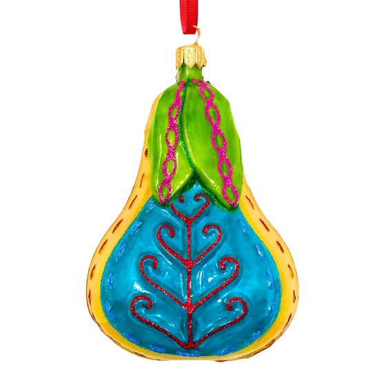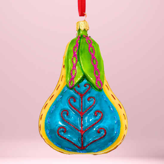 Inspired by the beauty of handcrafted folk art, this pear-shaped glass ornament is a fusion of bold color and intricate design. A luminous blend of turquoise, golden yellow, and lively green, accented with delicate vine-like patterns, evokes the charm of timeless craftsmanship. A piece that feels both nostalgic and refreshingly modern.