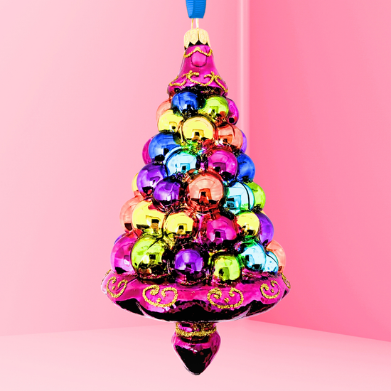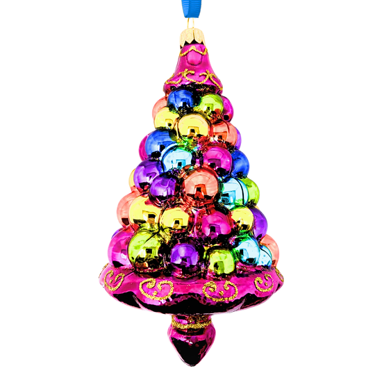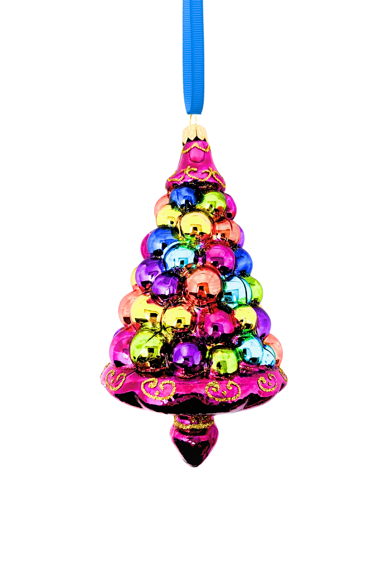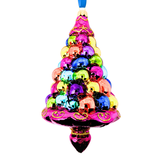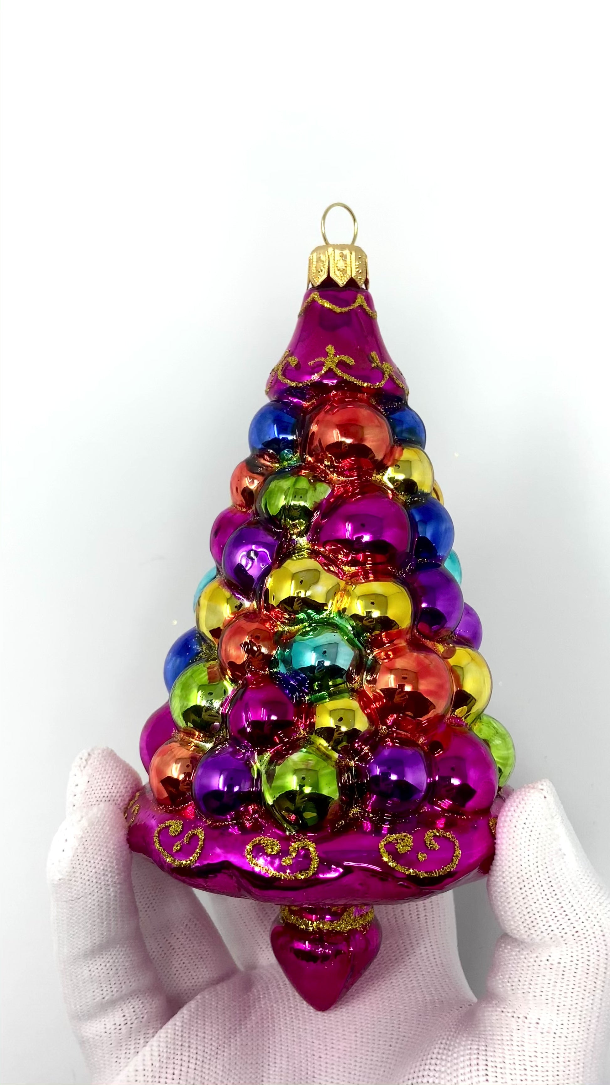 This fuchsia crowned tree blazes with saturated jewel tones that feel straight out of a holiday runway show. Globe after glossy globe stacks upward in a rainbow of metallic color, each one polished to mirror shine. It is a festival of light you can hang on a single branch and it steals attention with zero hesitation.