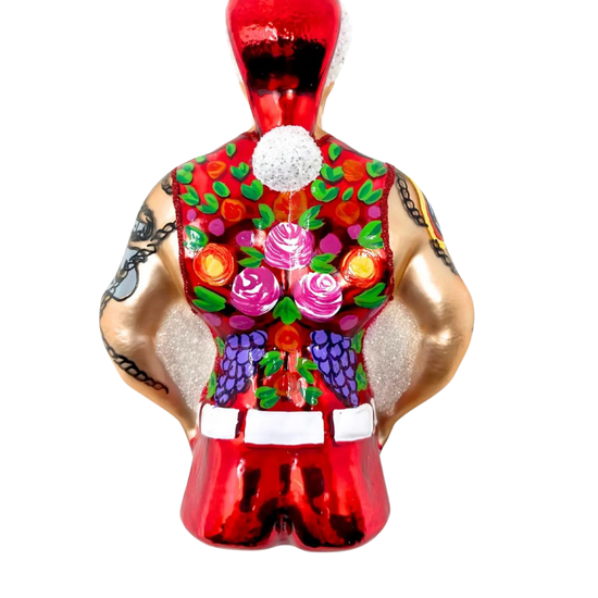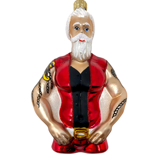 Ditch the sleigh—this Santa rides in with attitude. Muscled arms, tattooed with grit, peek from a crimson vest, while a gold-buckled belt cinches his fearless stance. This is Christmas, unchained—no reindeer, no rules, just raw holiday energy.