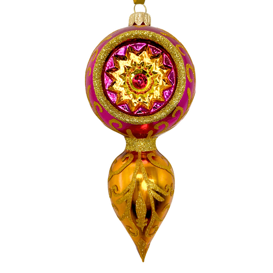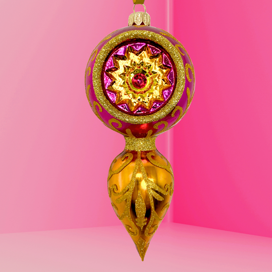 With a silhouette bathed in golden scrollwork and a fuchsia bloom at her core, The Grand Duchess carries herself with the kind of poise only generations can teach. A radiant sunburst reflector gleams at her center, wrapped in baroque flourishes and imperial charm.