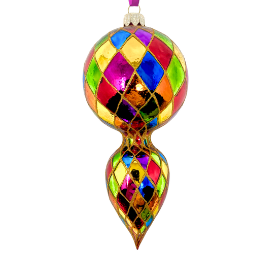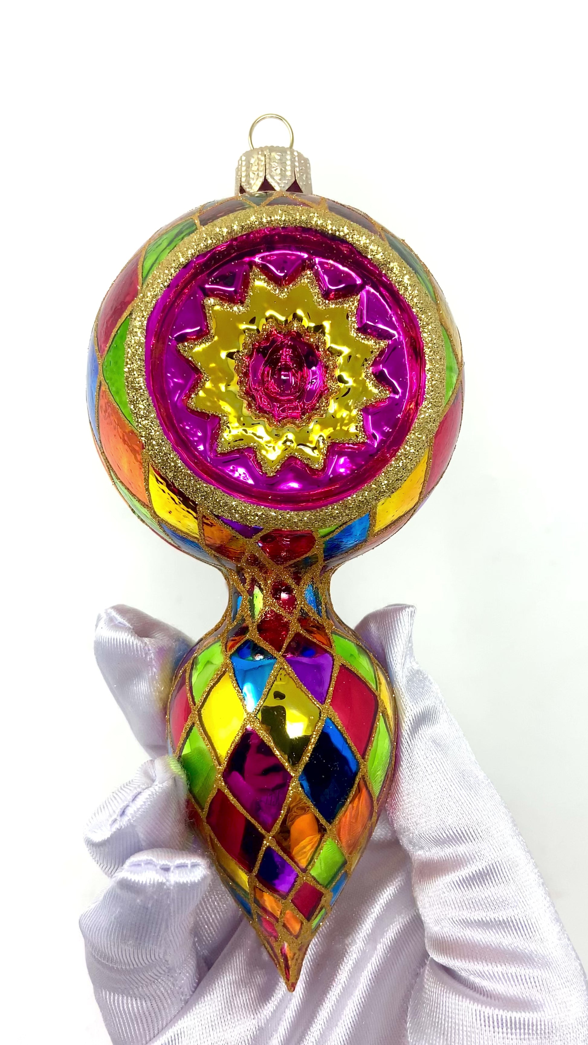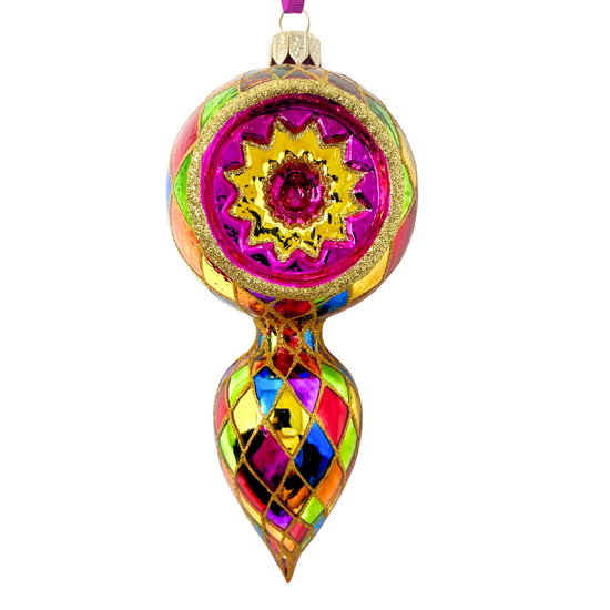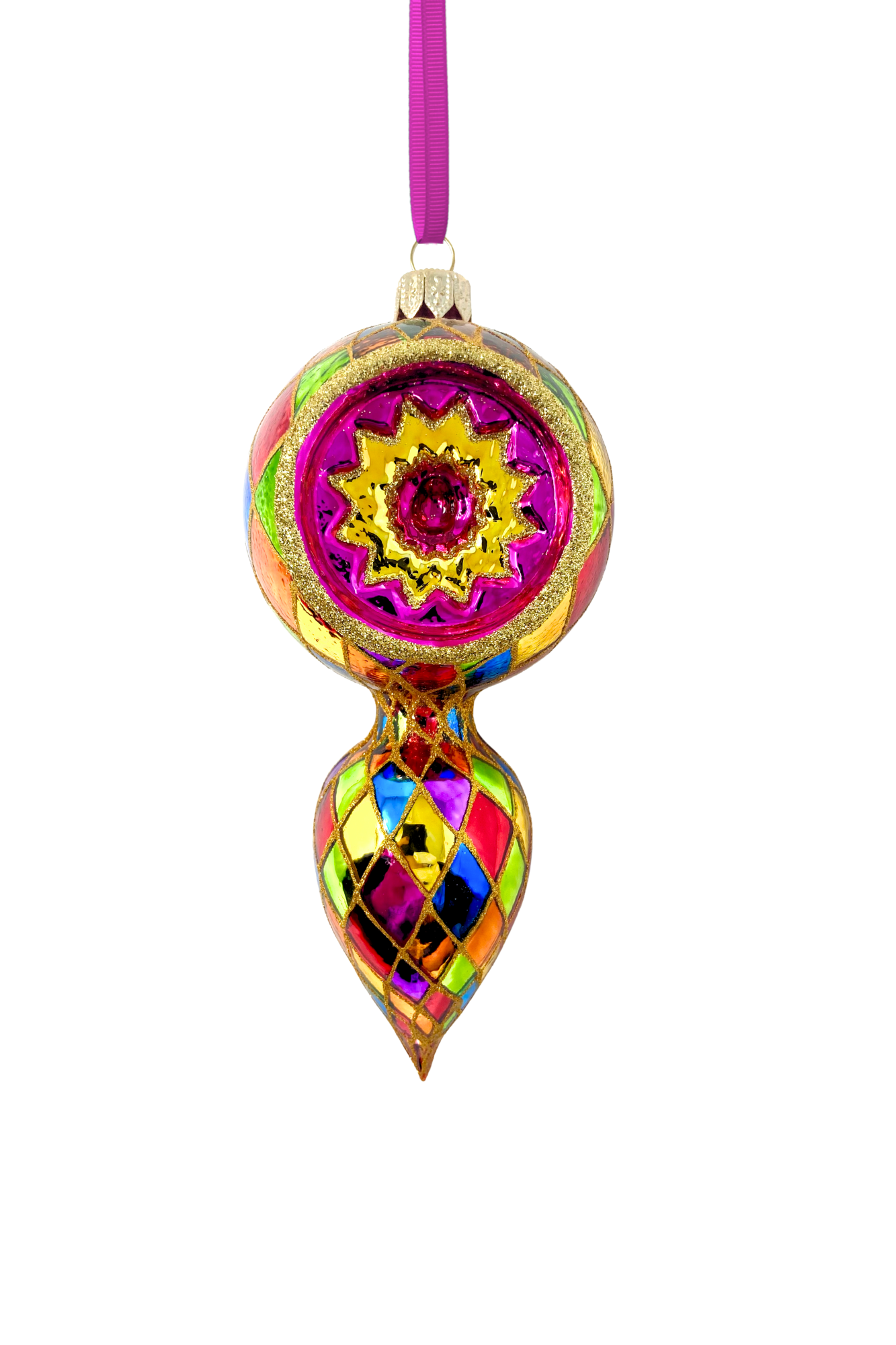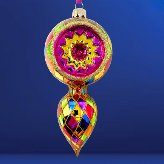 A burst of color framed in a jeweled reflector, finished with a drop that looks straight out of a costume designer’s sketchbook. Diamond panels, glossy shine, and unapologetic color stacking come together to create a pièce de resistance. Your tree has never felt this theatrical.