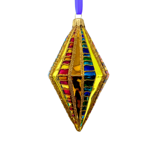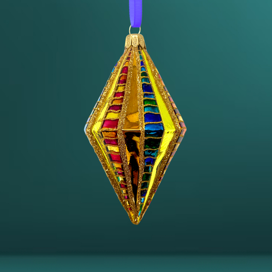 Shaped like a prism and dressed for the VIP lounge, this ornament turns every spin into a spectacle. Gold-lined ridges slice through rainbow panes like a roulette wheel in motion.