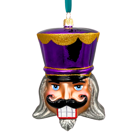A rich shade of imperial purple transforms this nutcracker into a regal masterpiece. Gold flourishes dance along his hat, illuminating the artistry of his expression. His presence is commanding, his allure undeniable—an ornament meant not just to adorn, but to enchant.