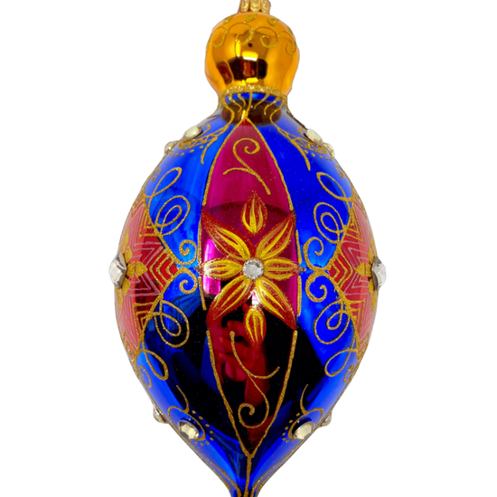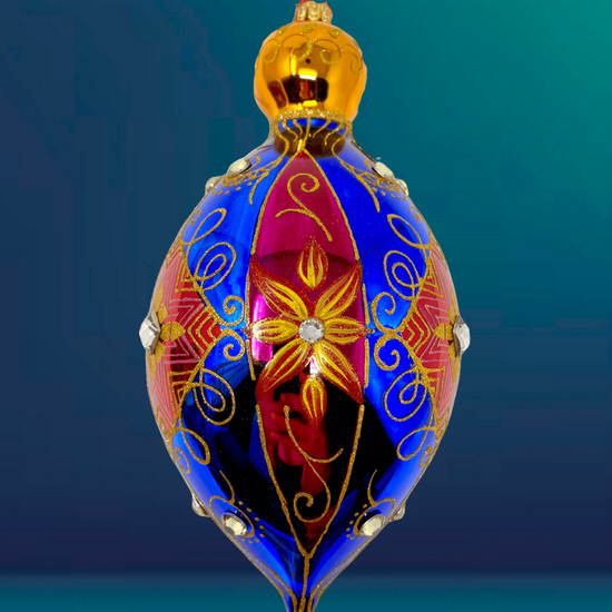 This rich, jewel-toned bauble is a love letter to lavish detail. Wrapped in royal blue and deep crimson, it features golden florals, scrolling accents, and crystal adornments. Every angle catches the light—and the attention.