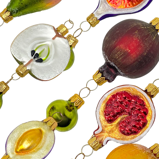 From figs to pomegranates, this garland celebrates the bounty of the Italian table. With six distinct hand-painted fruits—each sliced, glittered, and gleaming—this is orchard couture in blown glass form. Perfect for those who like their Christmas a little decadent and delightfully unexpected.