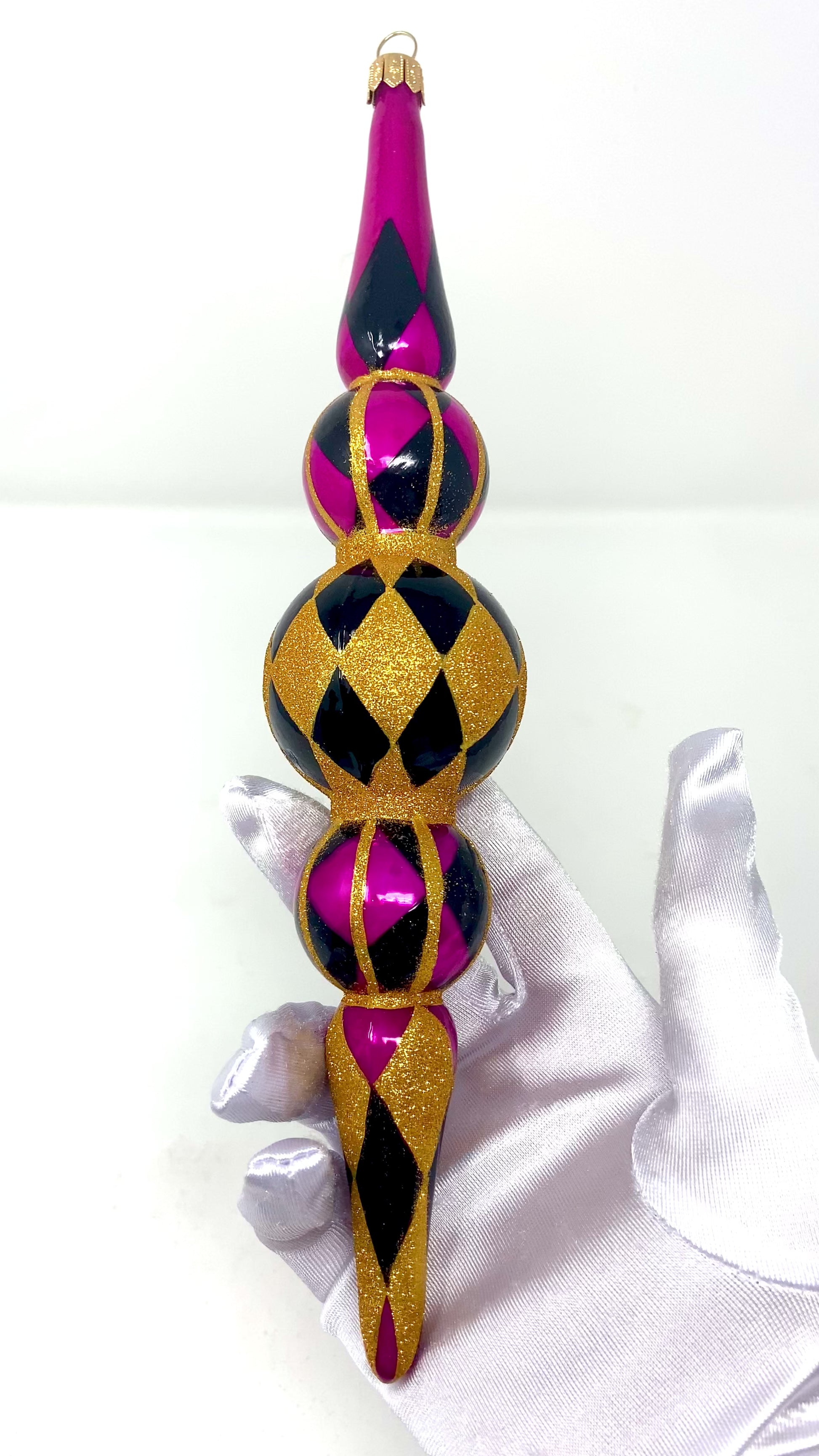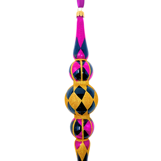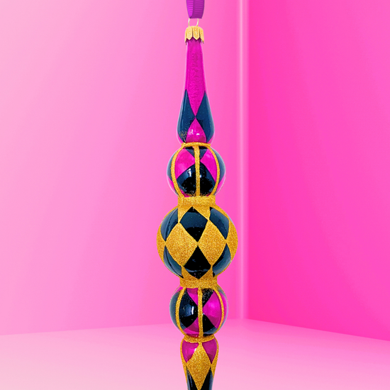 Sharp lines, high contrast, and a harlequin pattern that knows it owns the room. This elongated form draws the eye instantly, dripping in black, gold, and fuchsia. It’s sleek, sculptural, and unapologetically statement forward. Hang it high and let it tower in style. 1 of 1