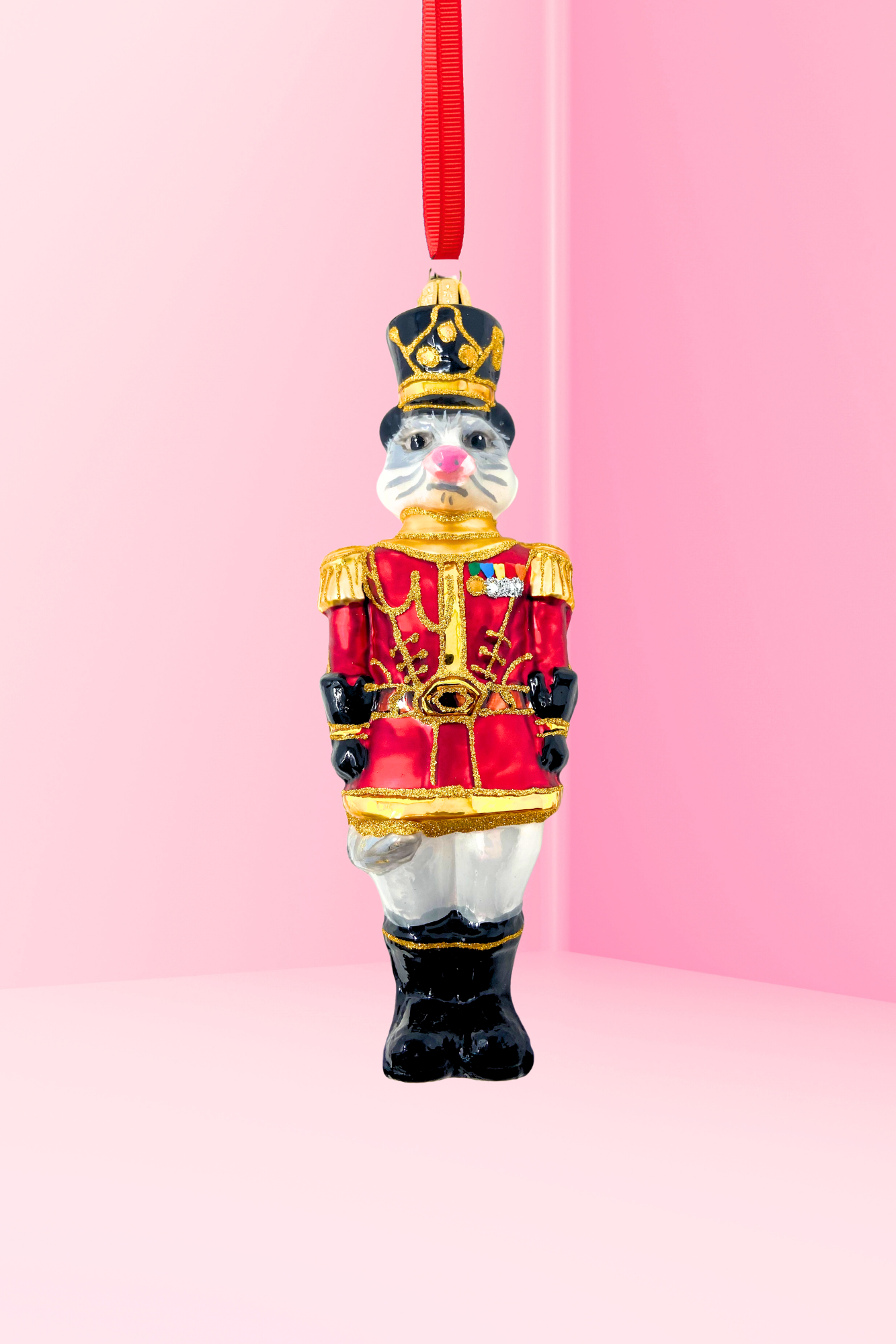 Draped in the crisp red of tradition, polished boots gleaming, this hand-blown glass ornament is a study in contradiction—playful yet poised, unconventional yet impeccable. A collector’s dream.