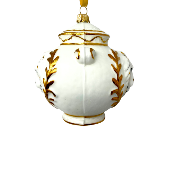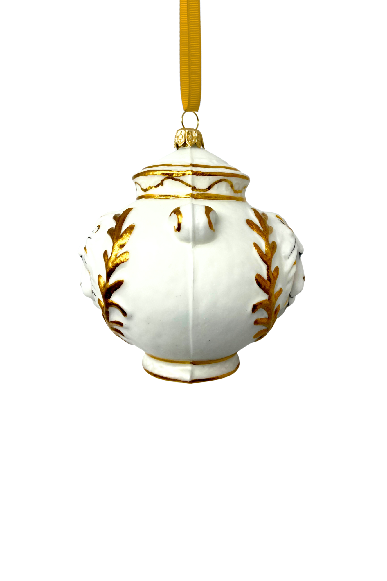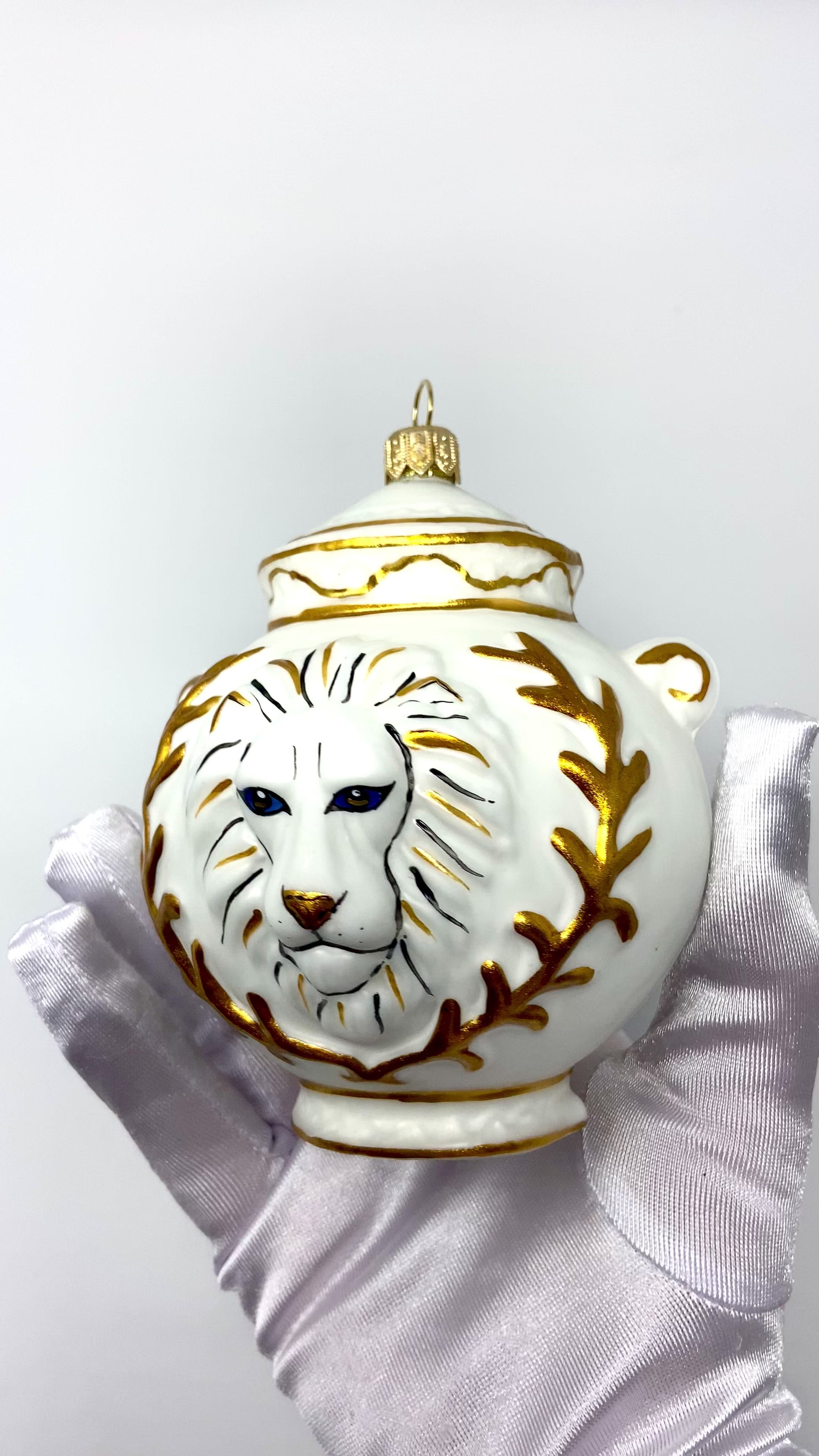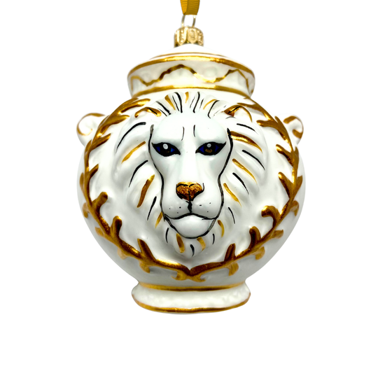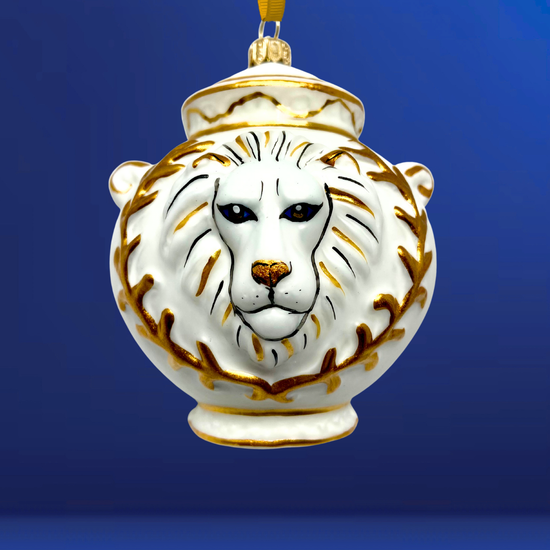This porcelain inspired jar features a sculpted lion framed in hand painted gold scrollwork. Calm eyes and measured expression give the piece quiet authority. It is strength interpreted through elegance, designed to ground the collection with presence.