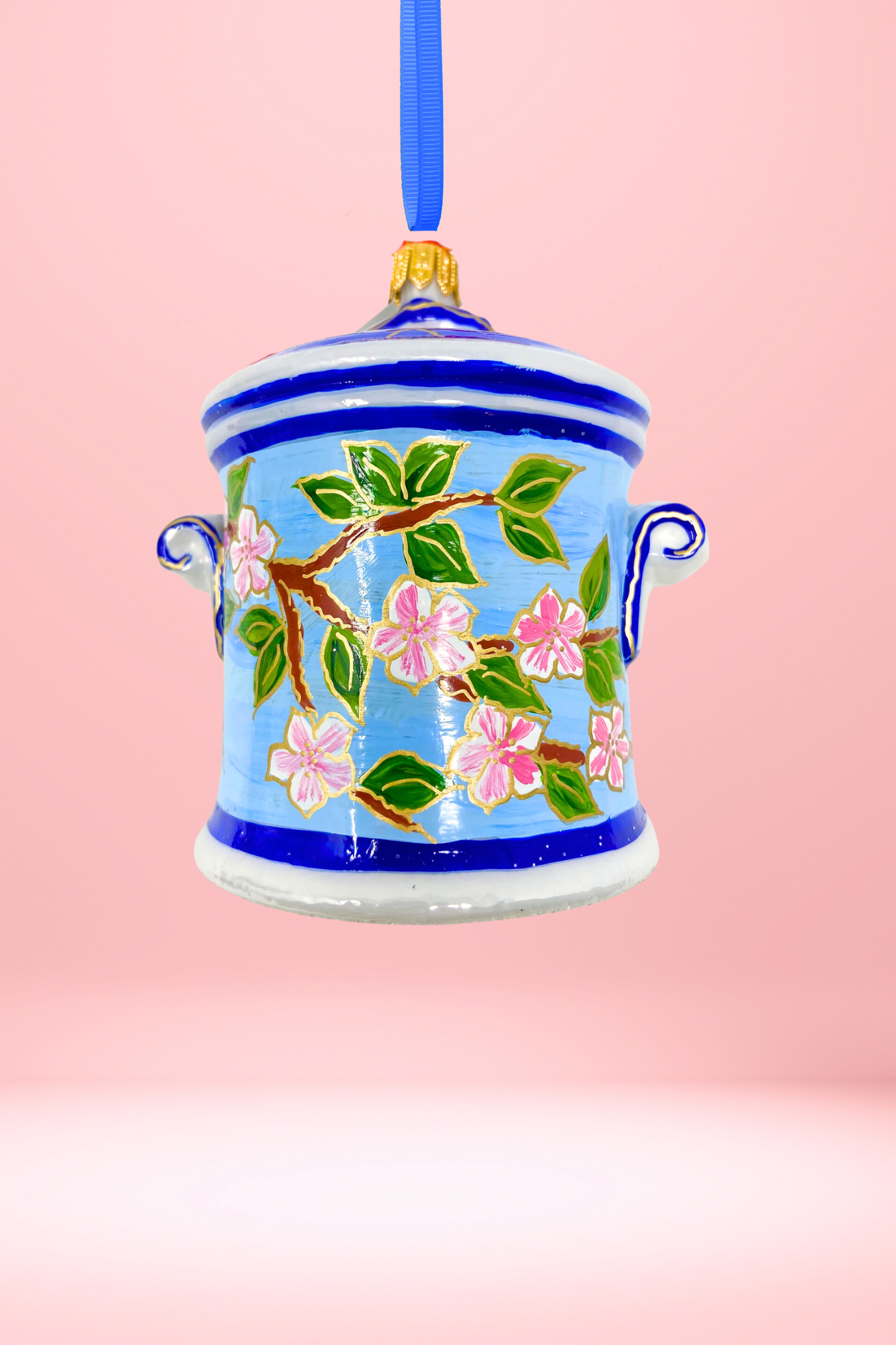 Pure sophistication in ceramic form. The Mancini Cookie Jar ornament is a poetic interplay of delicate florals and azure accents, embodying the essence of sunlit courtyards and whispered secrets over espresso. Classic, yet undeniably fresh—an objet d’art for the most discerning collector.
