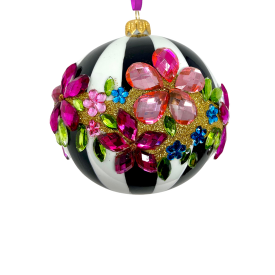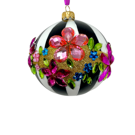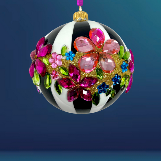 Draped in monochrome stripes and dripping with gem-bright blossoms, this bauble doesn’t whisper festive—it roars it. Think garden party meets runway show, with florals that sparkle like they’ve got somewhere fabulous to be.