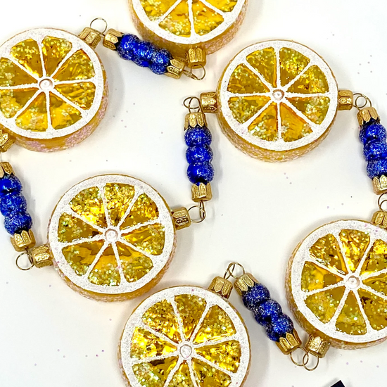 Inspired by the Amalfi Coast’s signature fruit, these hand-blown lemon slices glisten with golden glitter and nostalgia. The vibrant yellow is bold and classic, while flecked beads add dimension and sparkle like sunlit water. String it anywhere you want a splash of coastal charm and citrus joy.
