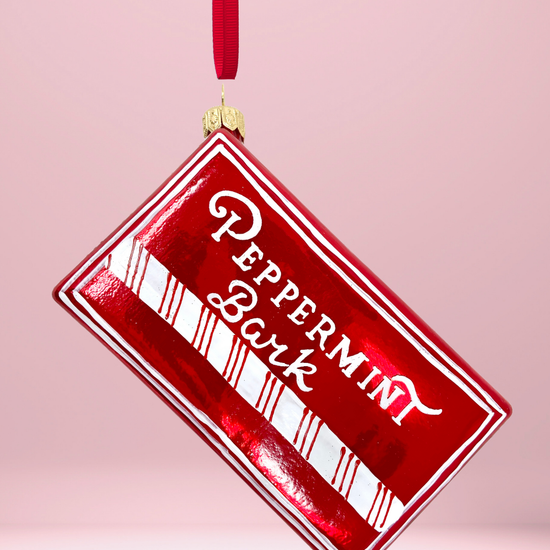 This Peppermint Bark Ornament is a tribute to the most beloved holiday confection, with bold red and white stripes and vintage-inspired typography. The glossy, hand-painted surface gleams like a wrapped treasure, adding a pop of festive energy to your holiday décor.
