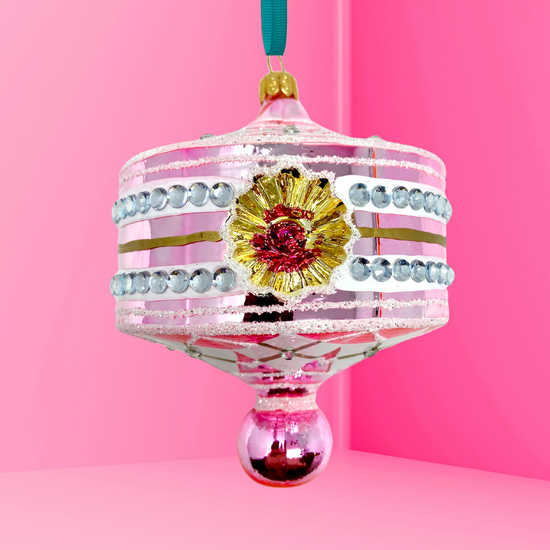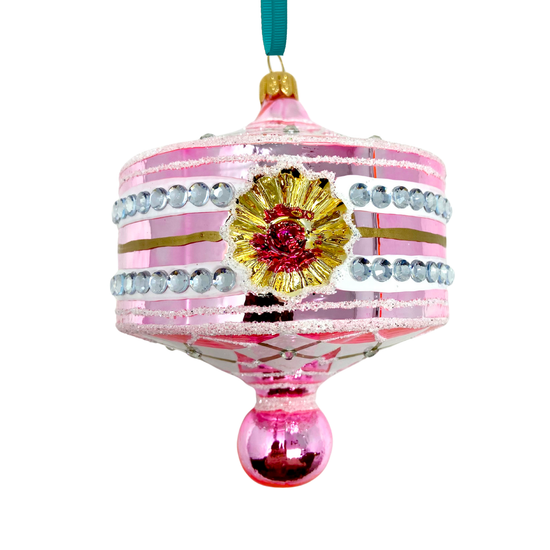 Blushing hues of pink and soft silver combine in this delicate harlequin reflector, reminiscent of vintage holiday magic. A golden sunburst glows from its center, framed by rows of icy embellishments and glistening stripes. The playful pink tones add a dreamy charm, making it a standout in any collection.