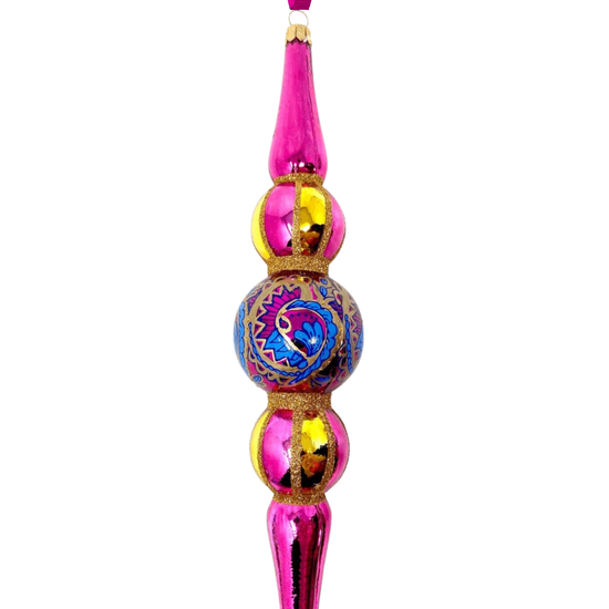 Wrapped in gold-dusted scrollwork and paisley motifs, this ornament is equal parts Versailles opulence and vintage holiday charm. Its rich magenta tones and vibrant blue filigree wink at tradition while twirling into something deliciously unexpected.