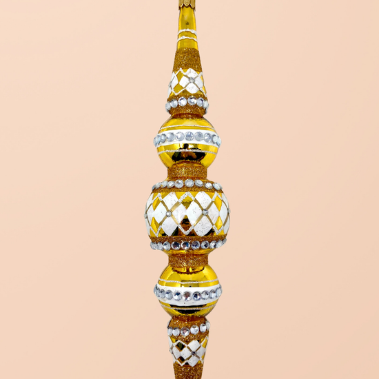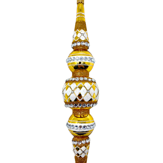 Latticed in diamond-white and studded with rhinestone brilliance, this golden wonder doesn’t whisper—she glitters. From the ballroom to the banister, it brings drama and dazzle to any tree that demands attention. High gloss. High stakes. All glamour.