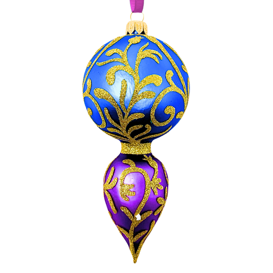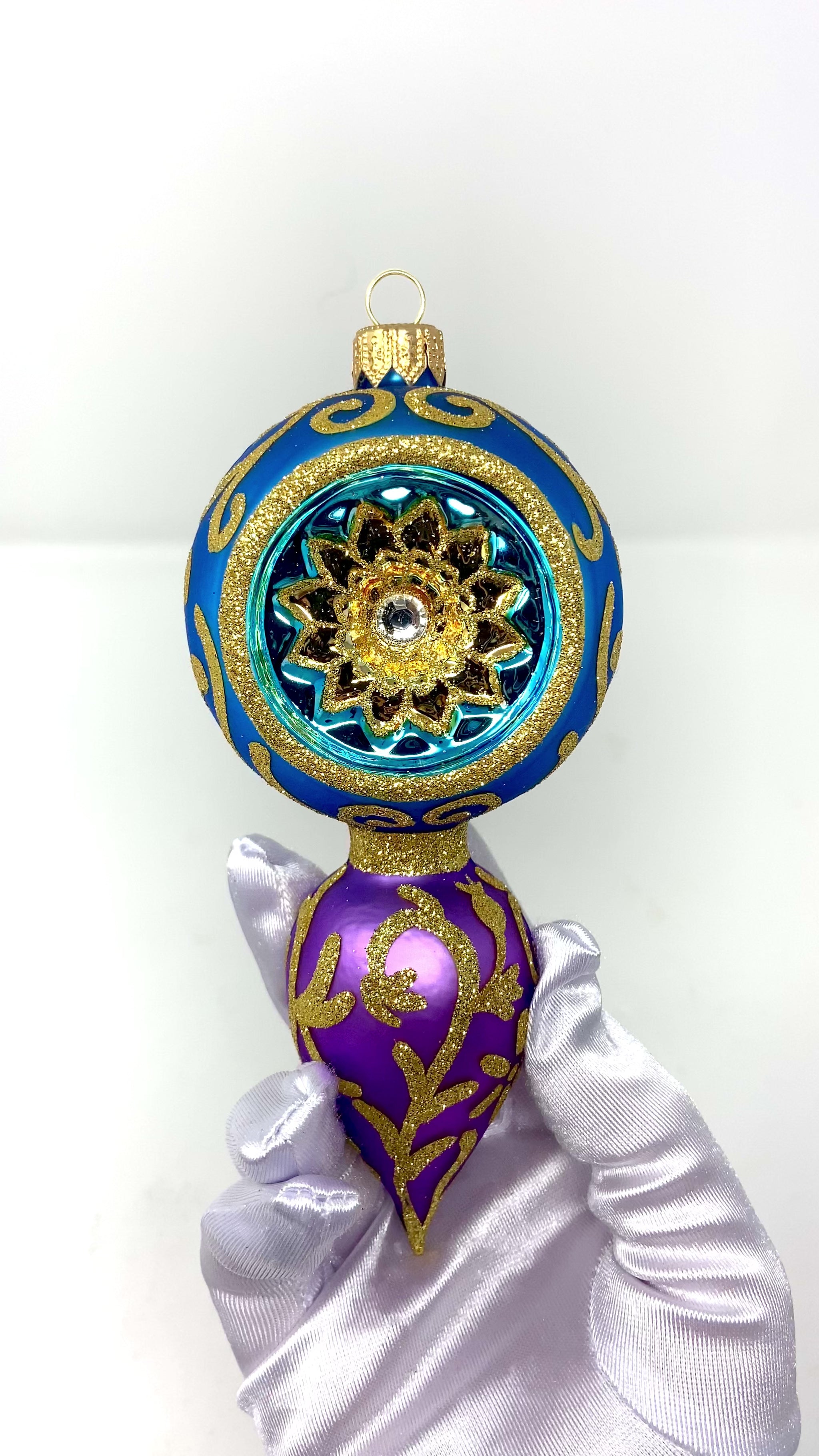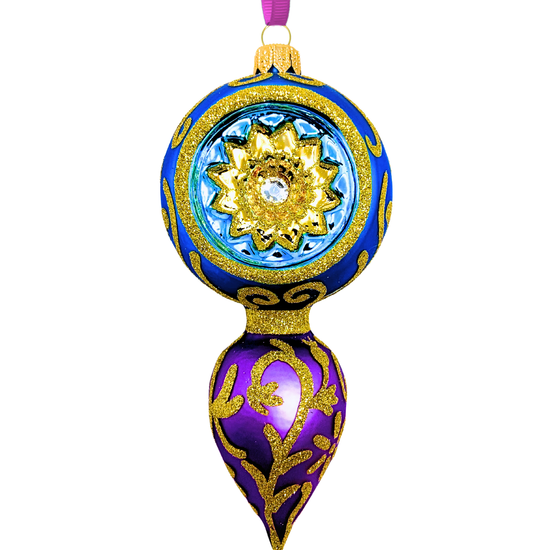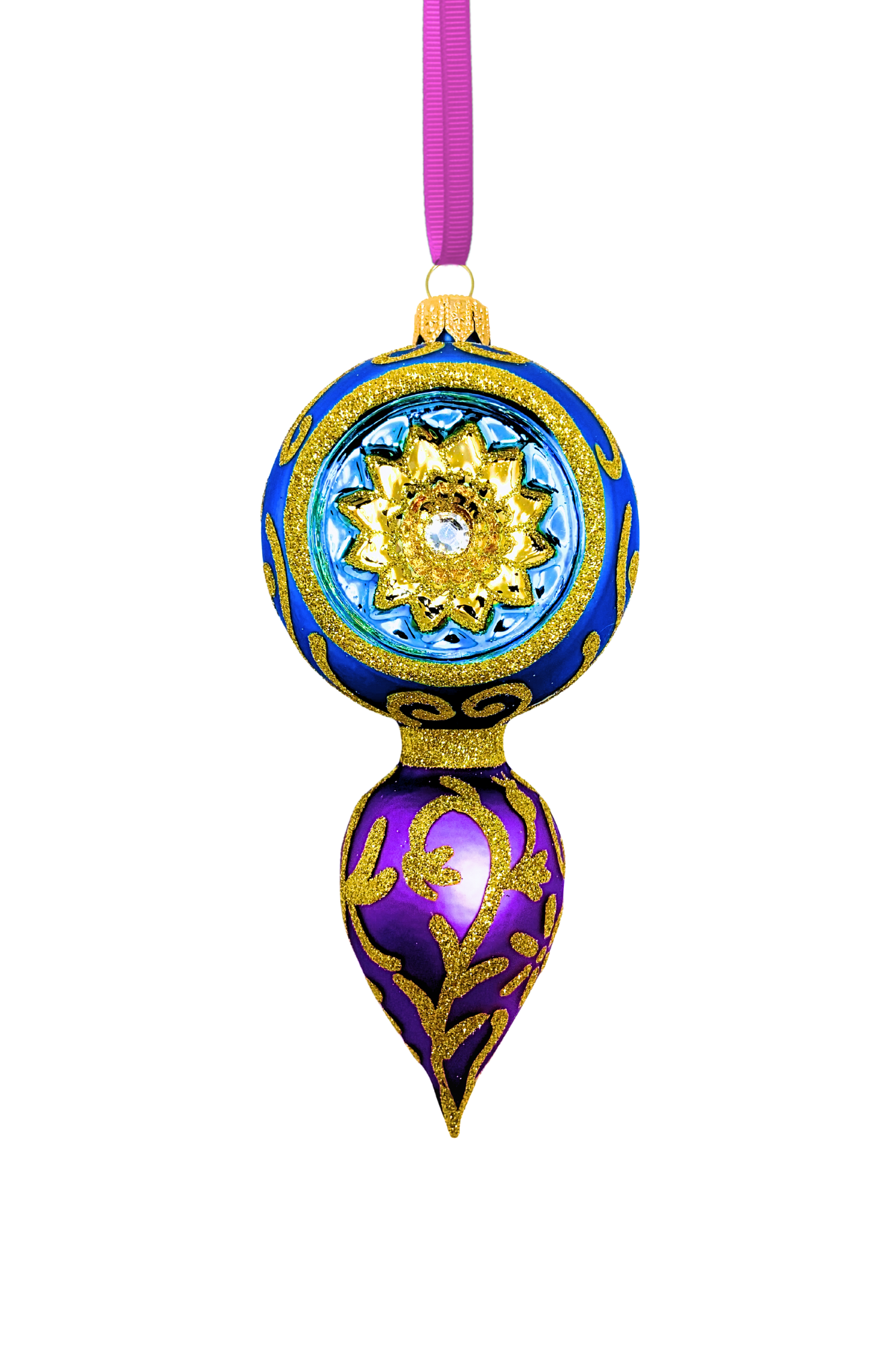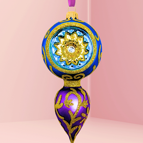 Cobalt blues, icy tones, and rich purples come together to spotlight a faceted snowburst center. Every angle catches the light with polished grace while the sculpted drop adds a sense of old-world charm. It’s commanding without trying too hard and instantly elevates the entire tree.