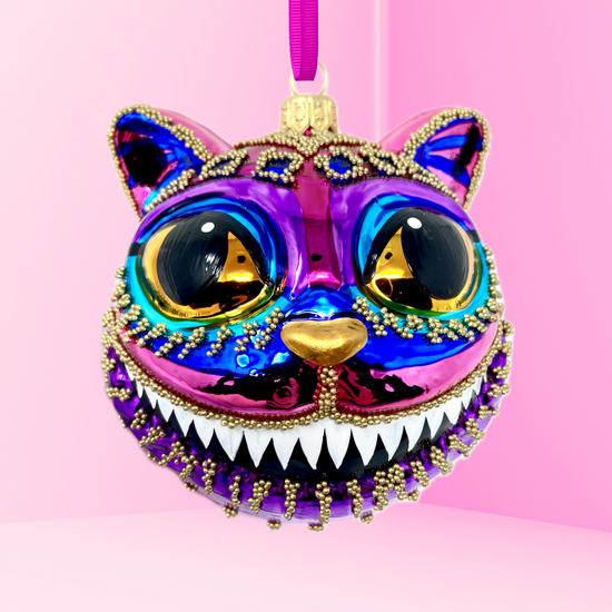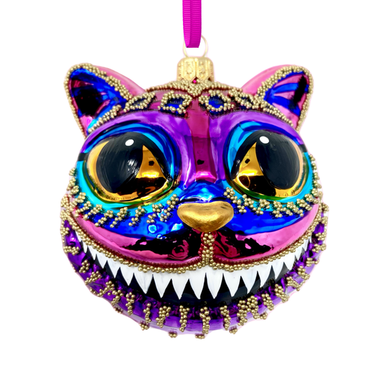 With electric pinks, deep blues, and golden details, this Cheshire Cat is a fever dream of whimsy and extravagance. Hand-painted with mesmerizing patterns and adorned with delicate gold beads, it’s a kaleidoscope of color that refuses to be ignored. Its wide, mischievous grin hints at secrets yet to be uncovered—because in Wonderland, rules are made to be broken.
