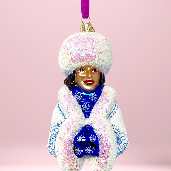 Refined yet bold, Sarah embraces the winter air with effortless grace. Wrapped in a plush fur hat dusted with iridescent shimmer, her sapphire blue scarf is adorned with intricate snowflakes. Inspired by the women who own the season with confidence, she embodies luxury, resilience, and undeniable charm.
