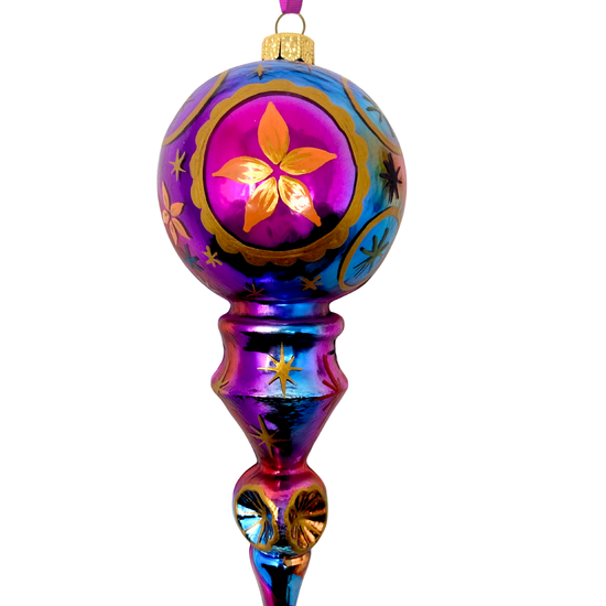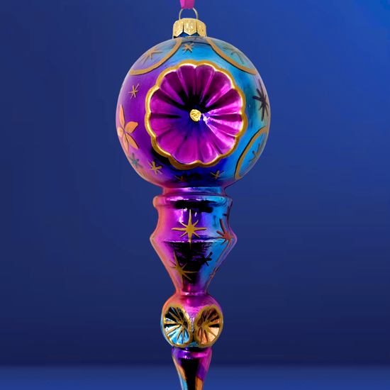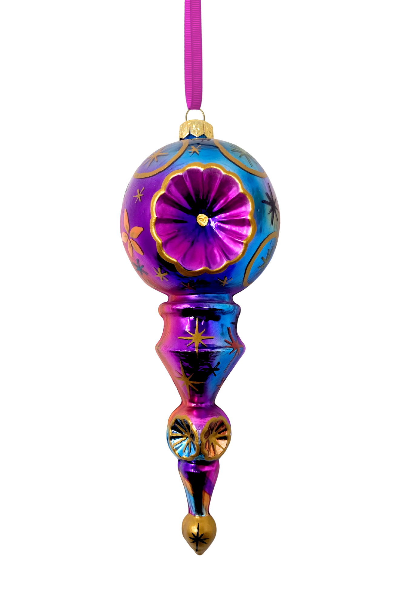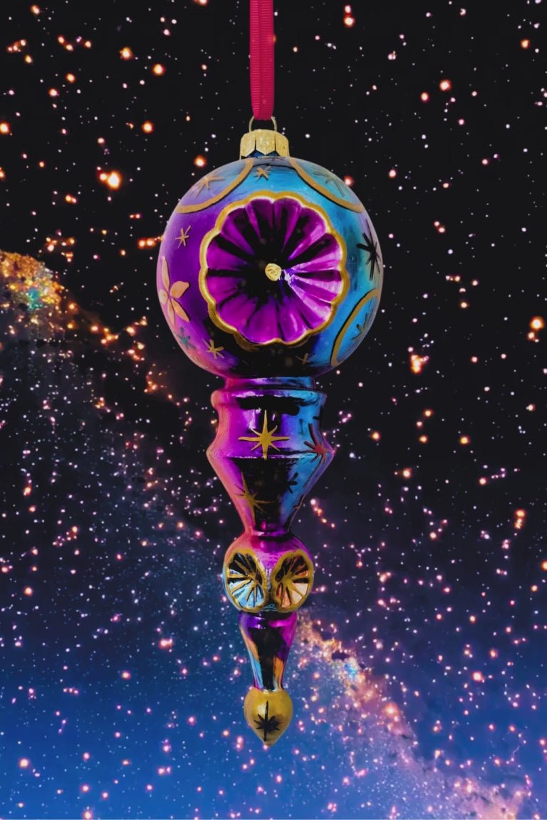 Metallic hues swirl across this comet inspired finial, catching light in a way that feels alive. Its rounded crown and tapered tail glow in shifting purples, blues, and gold, creating a luminous sense of movement, as if it just streaked past the sun and refused to dim. No two pieces share the same shape or flare at the tip, which gives each one its own cosmic identity. It is a limited treasure sculpted to resemble the real thing, ice and dust and brilliance traveling through the dark. Hang it and your tree becomes a sky worth watching.