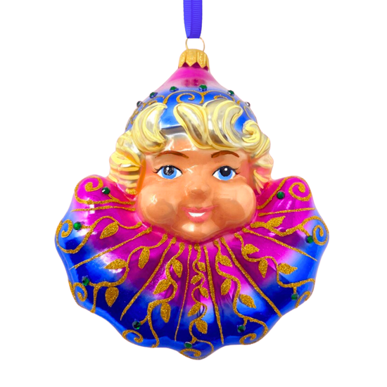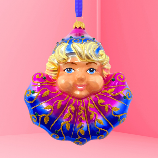 This cherubic face is framed by a ruffled collar of deep sapphire and fuchsia, shimmering with golden filigree that catches the light. With twinkling eyes and rosy cheeks, this little guardian brings a sense of warmth and nostalgia, evoking the wonder of holiday traditions. A timeless keepsake for dreamers and romantics alike.