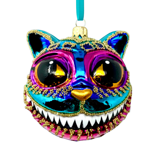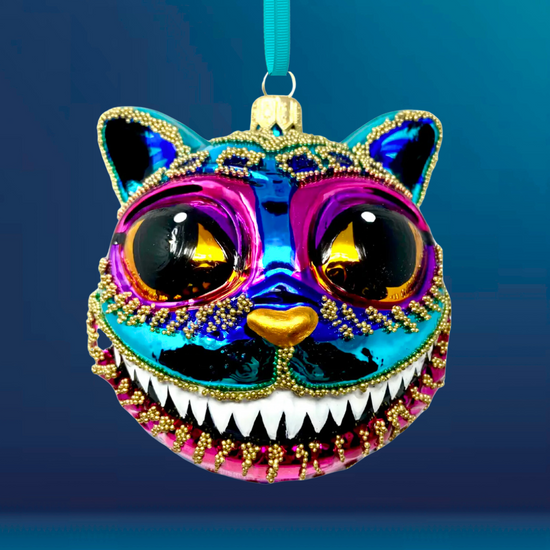 Drenched in rich teal, neon pink, and deep sapphire, this Cheshire Cat stares back with hypnotic golden eyes that seem to hold a thousand riddles. Gold bead embellishments and hand-painted flourishes elevate it from ornament to masterpiece, a surrealist twist on a beloved classic. It’s a piece for those who dance between the lines of reality and fantasy.